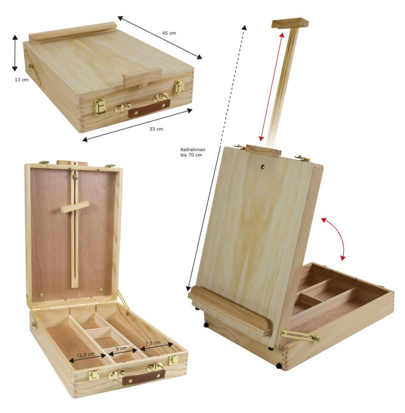 Grosses Malset mit viel Zubehör - idealer Einstieg in die Malerei oder als Reiseset für jeden Künstler. Die Staffelei eignet sich perfekt als Utensilienkoffer zur Aufbewahrung diverser Malartikel, beim Öffnen verwandelt sich der Deckel des Holzkoffers in eine große verstellbare Tisch-Staffelei auf der Keilrahmen bis zu 70cm hoch eingespannt werden können. Neben Keilrahmen, Skizzenstiften, Palette und Palettmesser haben wir hier für Sie unsere hochwertigen MEISTER Künstlerpinsel und STUDIO-Acrylfarben zusammengestellt, die Sie auch in anderen Formen und Größen bzw. Farben und Gebinden bei uns finden.