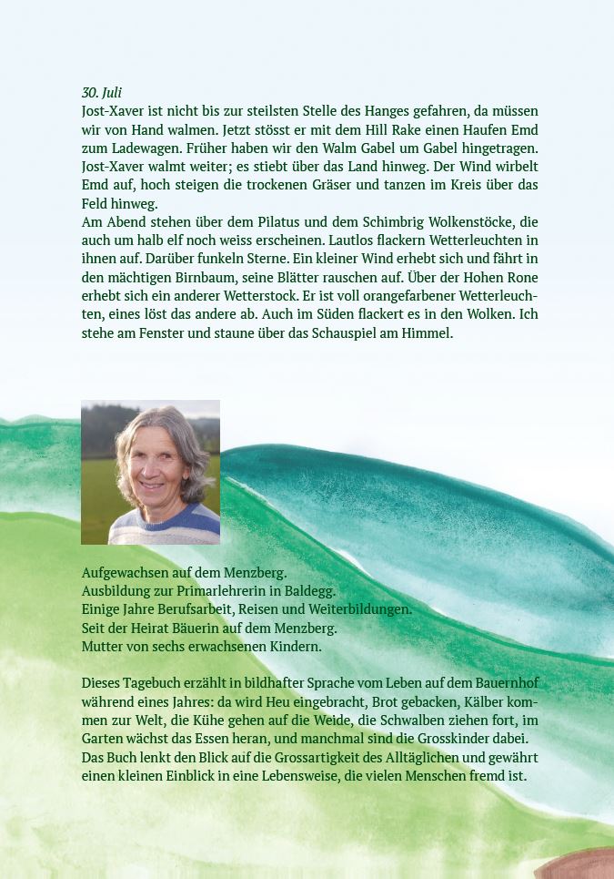 Dieses Tagebuch erzählt in bildhafter Sprache vom Leben auf dem Bauernhof während eines Jahres: da wird Heu eingebracht, Brot gebacken, Kälber kommen zur Welt, die Kühe gehen auf die Weide, die Schwalben ziehen fort, im Garten wächst das Essen heran, und manchmal sind die Grosskinder dabei. Das Buch lenkt den Blick auf die Grossartigkeit des Alltäglichen und gewährt einen kleinen Einblick in eine Lebensweise, die vielen Menschen fremd ist.